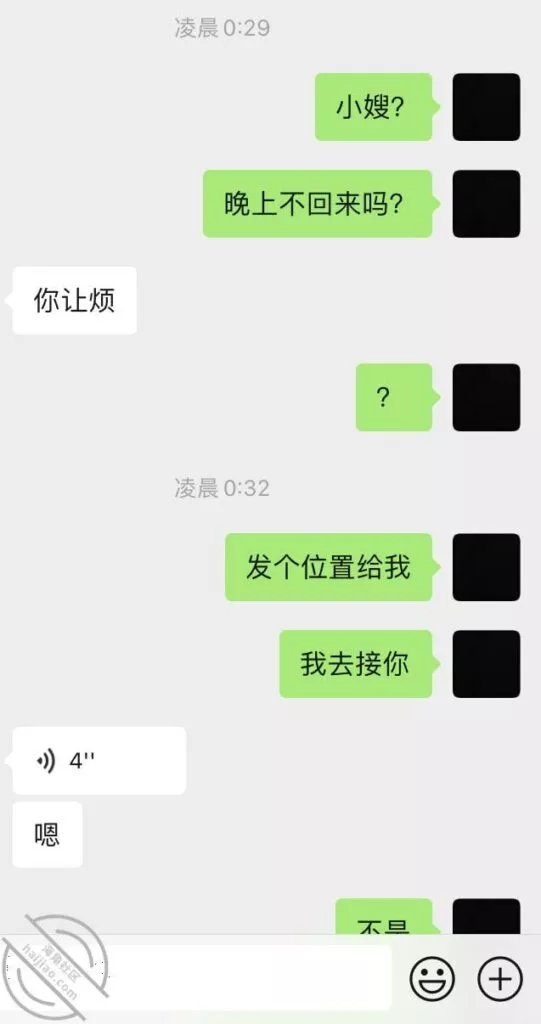 然后后面我哥暴怒完后,我就给小嫂子又发了信息,七七八八的聊天内容我全截下来了,不过小嫂子发的那两张聊天记录,是我哥发给她的,基本上都是骂人的话,还有就是揭小嫂子的底,问小嫂子是不是和别人睡了,表子之类的,反正挺难听的,我就给打码了,兄弟们不要见怪,有些不方便发出来,就大致口述一下。