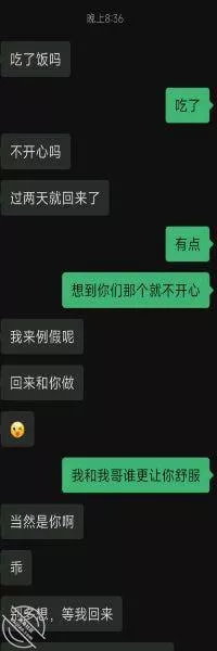 回到房间的我看着和小嫂子空白的微叉对话框,想着要不要主动问问小嫂子行程,可是立马被否定了,现在她和我哥和好了,我哥说不定会看她手机,所以我还是忍住了。于是带着幻想的我在想小嫂子会不会主动和我说,有没有把我放在心里的某一个位置,但是事实是没有,等到睡着都没有收到小嫂子的信息。