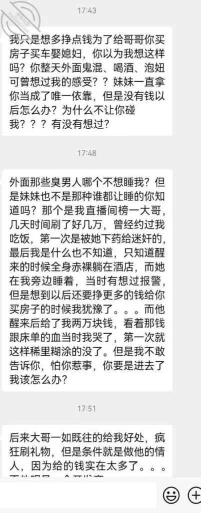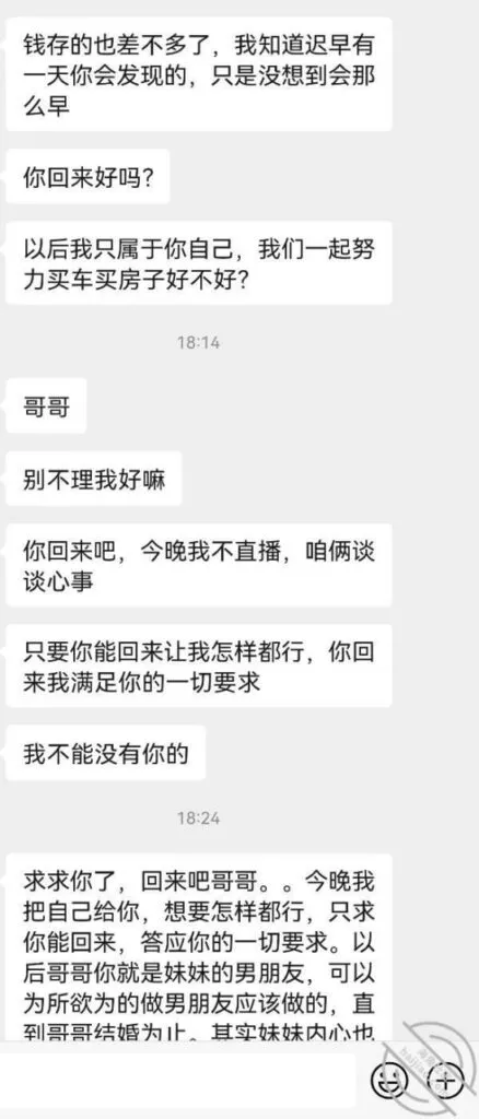 妹妹看着我脸色不对就跟我说实话了,偷偷买来用的,没想到被我发现了,说是直播间大哥送的。。。。就用过没几次。我还问她跟大哥出去过没,她支支吾吾说不出来,最后就说大哥约出去吃过饭,只是吃饭,什么也没干,还跟我撒娇拉着我胳膊说哥哥不要生气了嘛!我不是也为了多赚点钱。