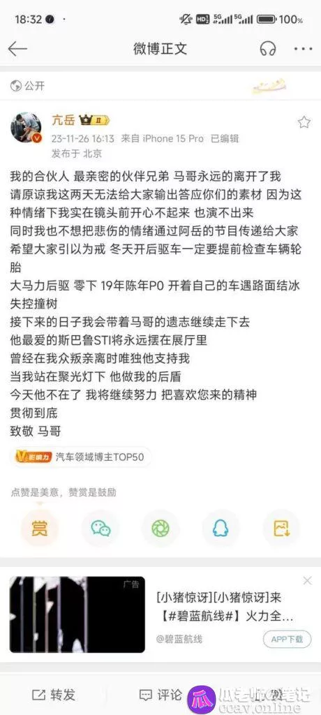 63万粉丝对于这些纯粹靠实力涨粉的博主来说已经算小有所成是很难做的,但他的事业也中止于此了,所以瓜老师善意的提醒一下有车的瓜友们,一定要多多注意路面状况,不超速不危险驾驶遵守交通安全规则