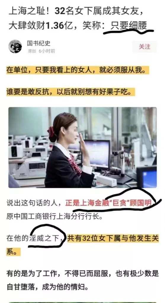 内地金融圈史诗级大瓜!上海工商银行行长顾国明被曝后宫佳丽32人