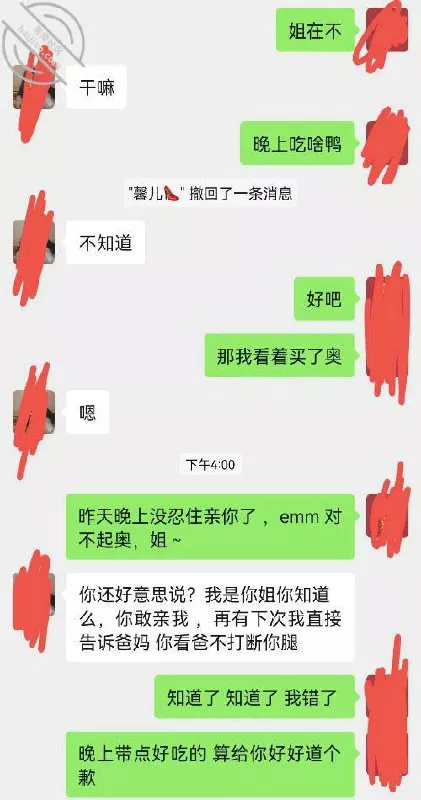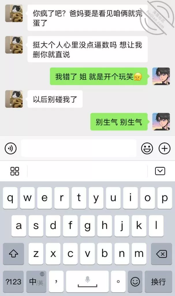 经过昨晚的事,今天一天老姐完全没理我(不了解情况的去看上一贴)下午的时候,我心里实在是忐忑不安,就主动给老姐发微信,老姐因为昨晚的事态度还是挺冷淡的,总感觉有点躲着我的意思