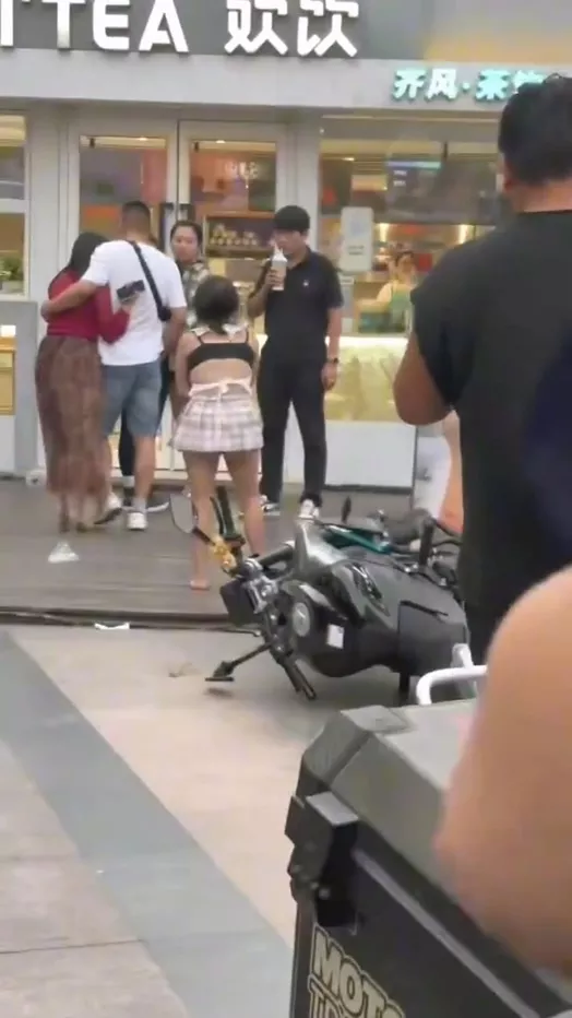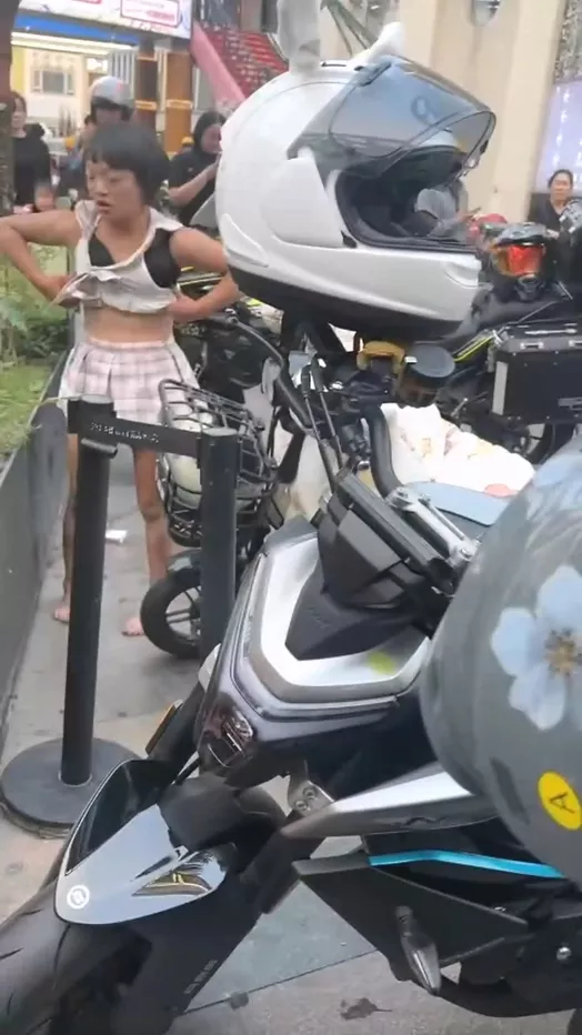 521淄博王府井缺爱的精神小妹搞出抽象事件。一名女子在王府井疯狂破坏摩托车,甚至试图纵火。她穿着暴露,言辞激烈,不断咒骂,迅速吸引了众多路人的围观。