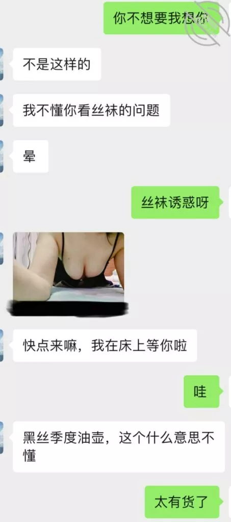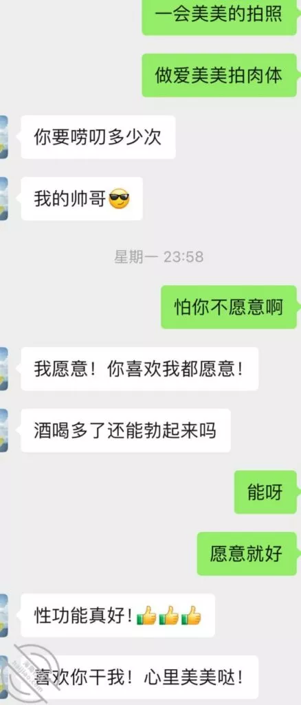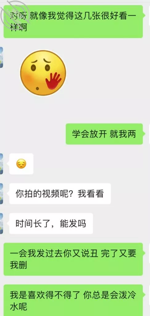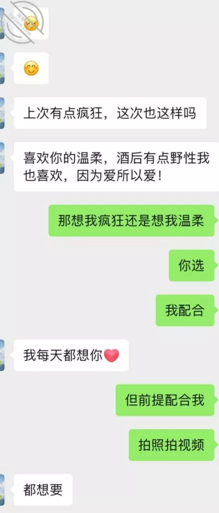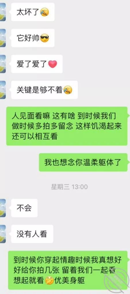 不过第三次虽然也没成功拍到照片和视频但是她开始松口至少穿情趣了而且在我引导下还主动给我发照片看,按后来她说 穿上情趣看自己照片 自己下面都受不了并且说第一次干涩 第二次有点水,那么第三次直接是润滑到极限,被我撩搔的不行不行,想到下面现在就会湿润。