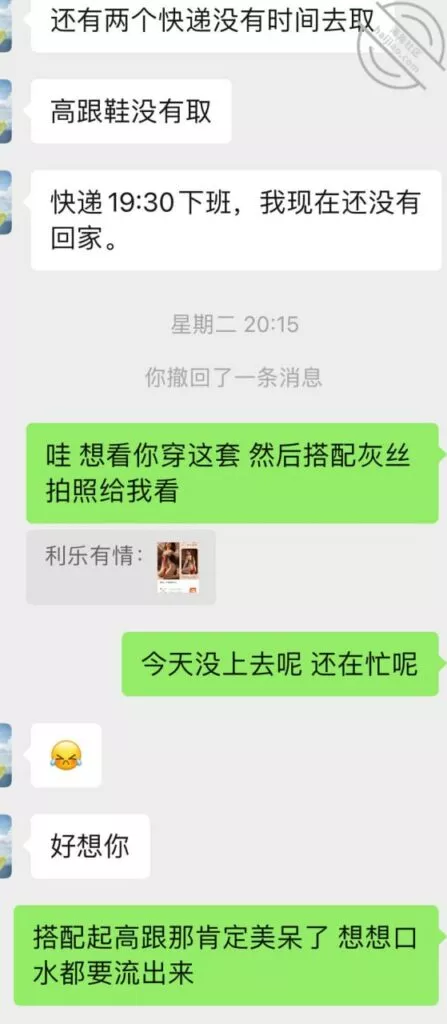 大概第五次结束后有两三天没联系吧,前面给利姐买了情趣高跟海友更多的情趣眼罩丝袜我看了一眼显示到货了,所以督促让她拿一下怕她忘记。