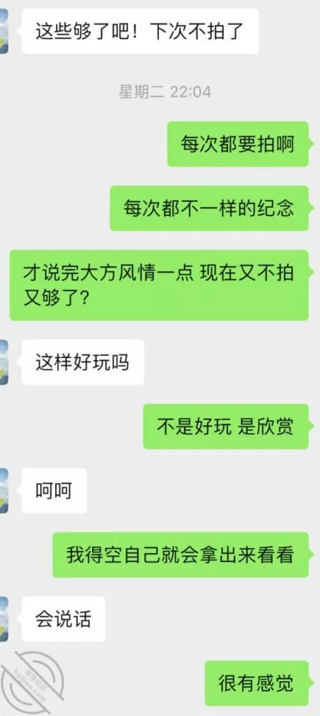 时间来到第三次前,又开始撩搔和我,我就提前撩到让她穿丝袜情趣等拍照,但是她还是没有答应,理解不了说年轻人的癖好,我直接就把我喜欢类型的情趣链接发给她让她去看选择,而后果然也是当她聊完就买了不同款式三套,并且我侧面和她聊拍照录像,因为她总是想纪念我一次顺水推舟和她说第三次要进行拍照录视频让她放开。